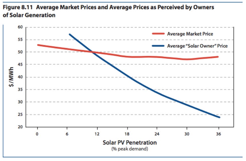 Because renewables are intermittent or bursty they also tend to produce lots of power at the same time so more supply of near zero marginal cost energy at these times depresses the clearing price even further. And as the penetration of renewables increases so to does the depression of market prices with the market saturated with supply at some times. Nor is this is a theoretical concept, the effect has been seen in the German energy market with a 2013 study finding that the value of wind power fell from 110% of the average power price to 50–80% as wind penetration increases from zero to 30% of total electricity consumption. For solar power, similarly low value levels are reached at 15% penetration. While all suppliers (generators) are affected by reducing market prices it’s the renewables that take the worst hit because their supply, and over-supply, tends to correlate even across large areas.3