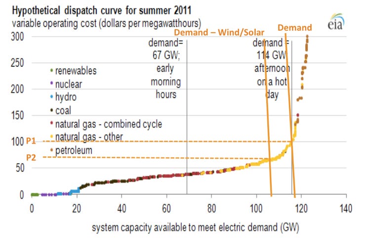 So let’s clap our Econ-101 hats on more firmly and have a closer look at how increasing renewables plays out in the market. In market theory price is determined by two factors the supply of some good and the demand for that good, more supply at same demand the price drops, more demand with the same supply the price rises. Now if you have more than one supplier in the market it turns out that the cheaper supplier sets the market ‘price’ as buyers vote with their pocket books, who’d have thought. All this is basic economic theory, and yes it applies to energy markets as to any other. So what happens when a supplier enters the market with a very cheap supply? The simple answer is that everyone who can, buys their energy product (in this case wind/solar) and this reduces the net demand for power (i.e. Net Demand = Demand - Wind/solar). As the net demand decreases so the clearing price also decreases because there’s less nett demand from customers.2 This is know as the merit-order effect and the diagram below (from Trembath and Jenkins 2015 article) illustrates this with wind/solar supply driving the clearing price down from P1 to P2 on the demand curve.