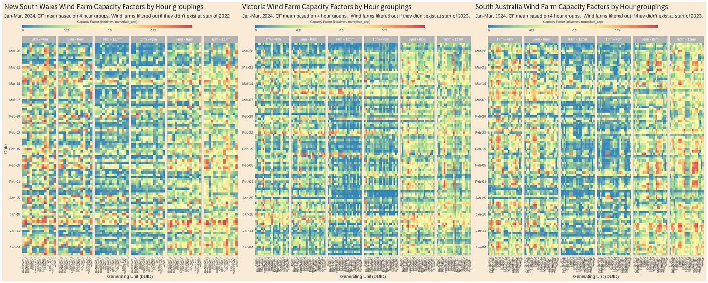 Here’s a comparison of Australian states (NSW, Victoria and SA) wind farm capacity factors, the ratio of actual performance to plate performance, over the Australian NEM. What we’d really love is strong negative-correlation (A is good when B is bad and B good when A is bad) but what we actually get is correlation across the day (A good when B good and vice versa) or zero correlation (just toss a coin). This means that adding generators that are geographically dispersed won’t help us (Image source: DataViz